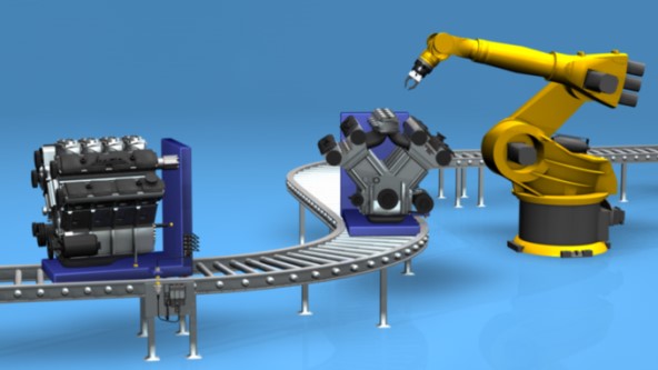 - Un capteur laser détecte les pare-chocs noirs dans une cellule d'assemblage
