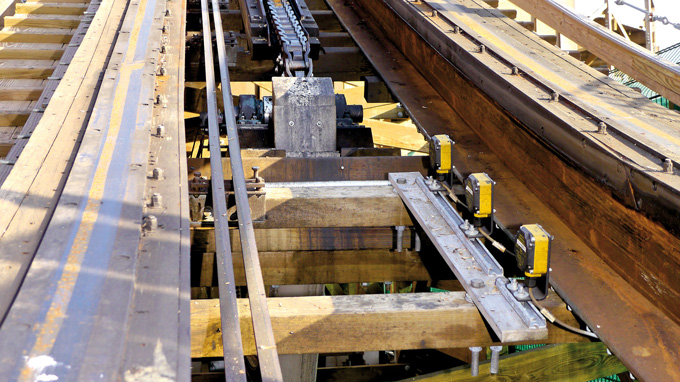 Le système est normalement surveillé et contrôlé par des capteurs de proximité. Les capteurs détectent les ailettes de frein en cuivre fixées en-dessous du train avec un espacement de 70 cm sur toute sa longueur. « Le cuivre est un métal non magnétique. C'est important pour réagir aux freins magnétiques qui ralentissent le train lorsque c'est nécessaire », explique Markus Spoth, directeur des systèmes d’ingénierie électrique de l'Europa Park. L'avantage gagné ici est un désavantage en ce qui concerne la détection par des capteurs inductifs. Les capteurs inductifs, qui possèdent un noyau de ferrite, ne réagissent pas bien vis-à-vis du cuivre. Par conséquent, dans ce cas-ci, il fallait utiliser un capteur factor 1 qui garantit la même distance de commutation pour tous les métaux. Le capteur NI75 de Turck était supérieur aux capteurs factor 1 de la concurrence. Aucun autre capteur switch n'offrait une distance de commutation aussi fiable d'environ 6 centimètres. Le train peut avoir un décalage de 2,5 centimètres à gauche ou à droite des rails. « Les capteurs détectent l'ailette de frein de 12 mm fixée sur le train à partir du dessous et sur le côté. Dans les deux cas, les performances de détection doivent être irréprochables. Avec les commutateurs Turck, cette conception non standard est possible. Ils fournissent un point de commutation ultrafiable dans les deux positions de montage », explique M. Gebhardt.