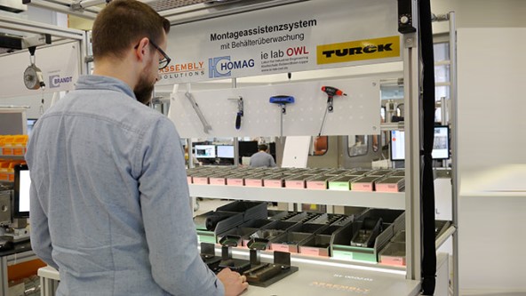 The SmartFactoryOWL is a demonstration platform that provides support in intelligent automation for small to medium-sized companies on the way to digitized production. As a partner of the SmartFactoryOWL, Turck has been represented since 2016 with a pick-to-light system, to which researchers and students of the OWL University of Applied Science have now added a put-to-light system and a key indicator cockpit. The put-to-light system optimizes the supply of materials, while the key indicator cockpit provides guidance for the worker during the assembly process. The cooperation between Turck, the SmartFactoryOWL and Assembly Solutions enabled the development of a projection-based assistance system using Easy Array light curtains.