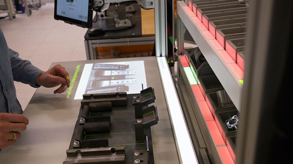 Assembly Solutions developed a system that projects the current work instructions and the components directly onto the workbench by means of a projector. The projection shows the necessary information for correct assembly using images, symbols and plain text. Light beams, arrows or other markings indicate which component currently has to be fitted and how. This guides the operator continuously through the process, thus reducing the error rate and boosting productivity.